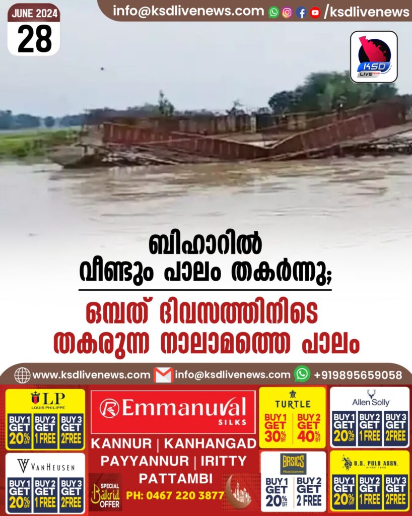 വ്യാഴാഴ്ച കൃഷ്ണഗഞ്ച് ജില്ലയില് മറ്റൊരു പാലം തകർന്നിരുന്നു. ജൂണ് 23ന് ഈസ്റ്റ് ചമ്ബാരൻ ജില്ലയിലും നിർമാണത്തിലുള്ള ഒരു പാലം തകർന്നു. ജൂണ് 22ന് സിവാനില് ഗന്ധക് കനാലിന് കുറുകെ നിർമിച്ച മറ്റൊരു പാലവും തകർന്നു. ജൂണ് 19ന് അരാരിയയില് ബക്ര നദിക്ക് കുറുകെ കോടികള് ചെലവിട്ട് നിർമിച്ച കൂറ്റൻ പാലം തകർന്നിരുന്നു. പാലങ്ങള് തകരുന്ന സംഭവത്തില് നിതീഷ് കുമാർ സർക്കാറിനെതിരെ വ്യാപക വിമർശനമുയരുകയാണ്.