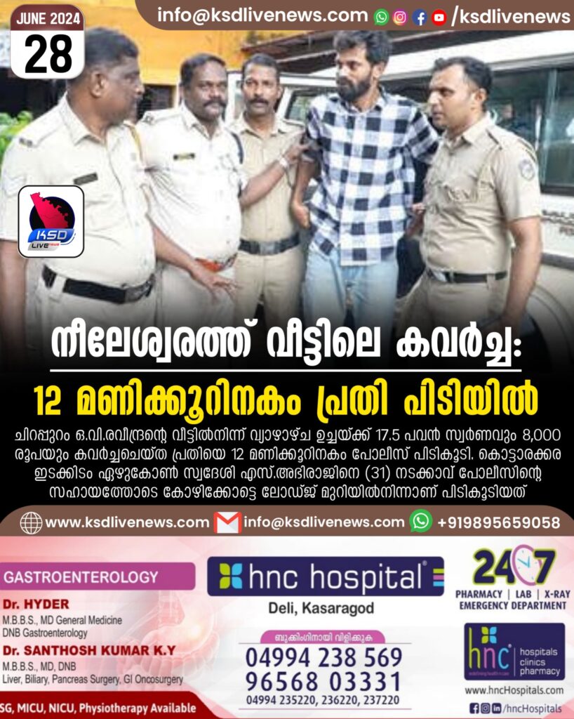 നീലേശ്വരത്ത് വീട്ടിലെ കവർച്ച: 12 മണിക്കൂറിനകം പ്രതി പിടിയിൽ