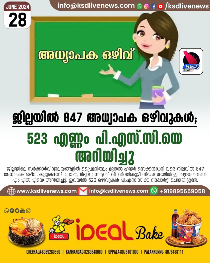 പൊയിനാച്ചി : ജില്ലയിലെ സർക്കാർവിദ്യാലയങ്ങളിൽ പ്രൈമറിതലം മുതൽ ഹയർ സെക്കൻഡറി വരെ നിലവിൽ 847 അധ്യാപക ഒഴിവുകളുണ്ടെന്ന് പൊതുവിദ്യാഭ്യാസമന്ത്രി വി. ശിവൻകുട്ടി നിയമസഭയിൽ ഇ. ചന്ദ്രശേഖരൻ എം.എൽ.എയെ അറിയിച്ചു. ഇവയിൽ 523 ഒഴിവുകൾ പി.എസ്.സിക്ക് റിപ്പോർട്ട് ചെയ്തിട്ടുണ്ട്.
