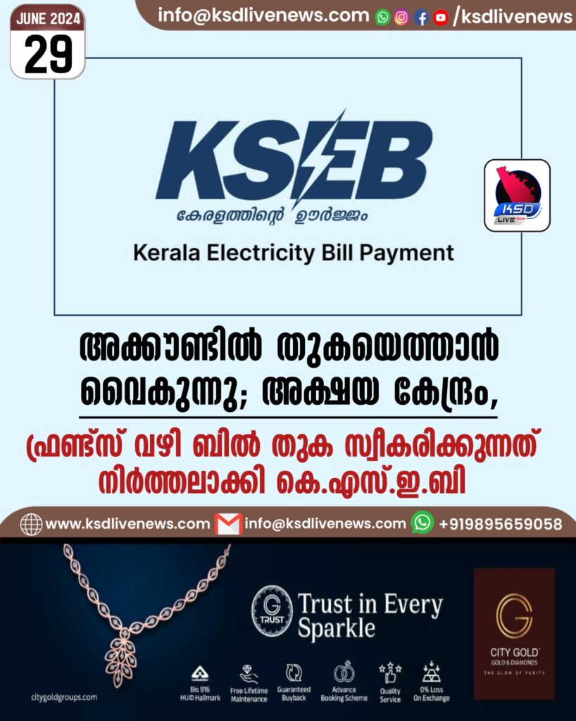 അക്കൗണ്ടിൽ തുകയെത്താൻ വൈകുന്നു; അക്ഷയ കേന്ദ്രം, ഫ്രണ്ട്സ് വഴി ബിൽ തുക സ്വീകരിക്കുന്നത് നിർത്തലാക്കി കെ.എസ്.ഇ.ബി