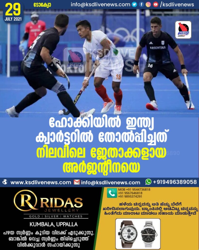 ഹോക്കിയില് ഇന്ത്യ ക്വാര്ട്ടറില്; തോൽപ്പിച്ചത് നിലവിലെ ജേതാക്കളായ അര്ജന്റീനയെ