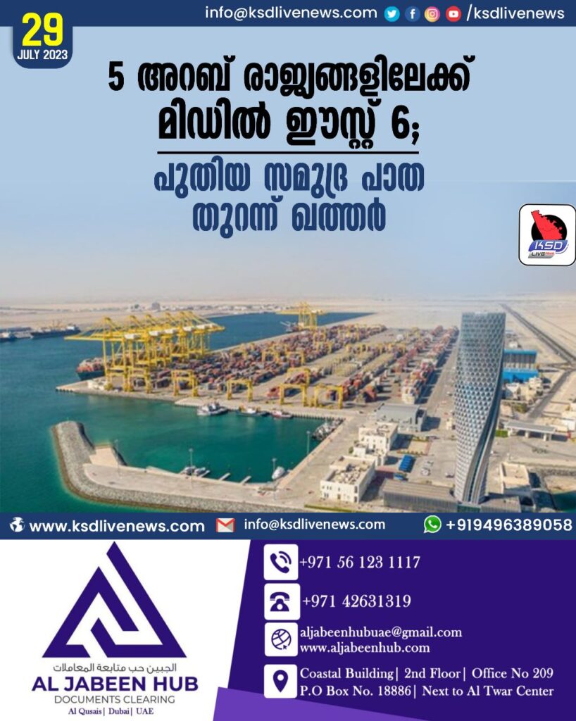 ദോഹ: അഞ്ചു അറബ് രാജ്യങ്ങളുടെ തുറമുഖങ്ങളുമായി ഖത്തർ അഹമ്മദ് അന്താരാഷ്ട്ര തുറമുഖത്തെ ബന്ധിപ്പിക്കുന്ന പുതിയ സമുദ്ര പാത സർവീസിന് ഖത്തർ തുടക്കം കുറിച്ചു. ഖത്തറിലെ അഹമ്മദ് അന്താരാഷ്ട്ര തുറമുഖം സൗദിഅറേബ്യ ,ഒമാൻ ,ഈജിപ്ത് ,യുഎഇ ,മൊറോക്കോ, എന്നീ തുറമുഖങ്ങളിലേക്കാണ് പുതിയ മിഡിൽ ഈസ്റ്റ് -6 സമുദ്ര പാതയിലുടെ സർവീസ് നടത്തുക. പുതിയ ജലപാത വരുന്നതോടെ രാജ്യങ്ങൾക്കിടയിൽ നേരിട്ടുള്ള വ്യാപാര വാണിജ്ജ്യ സാധ്യതകൾ വേഗത്തിലാക്കുവാനും,അമിത യാത്ര ചെലവുകൾ കുറക്കുവാനും സാധിക്കും. ഹമദ് ഇൻറർനാഷണൽ തുറമുഖം (ഖത്തർ ),ദമാം തുറമുഖം (കെ.എസ്.എ), ജുബൈൽ തുറമുഖം( കെ.എസ്.എ), ജബലലി ടി -2 തുറമുഖം (യുഎഇ ) ,ദുകം തുറമുഖം(ഒമാൻ),സലാലതുറമുഖം( ഒമാൻ ),സൂയസ് തുറമുഖം (ഈജിപ്ത് )പോർട്ട് സൈയിഡ്ഈസി (ഈജിപ്ത് ),ടാൻജിയർ മെഡ് തുറമുഖം (മൊറാക്കോ) ടാൻജിയർ മെഡ്-2 തുറമുഖം (മൊറാക്കോ)എന്നിങ്ങനെ പത്തോളം തുറമുഖങ്ങളിലൂടെ ആകും പുതിയ സർവീസ്.