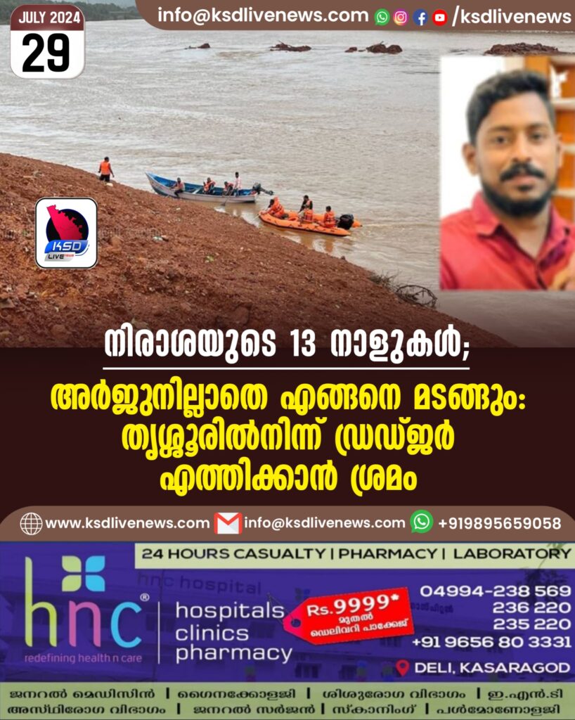 നിരാശയുടെ 13 നാളുകൾ; ‘അർജുനില്ലാതെ എങ്ങനെ മടങ്ങും: തൃശ്ശൂരിൽനിന്ന് ഡ്രഡ്ജർ എത്തിക്കാൻ ശ്രമം