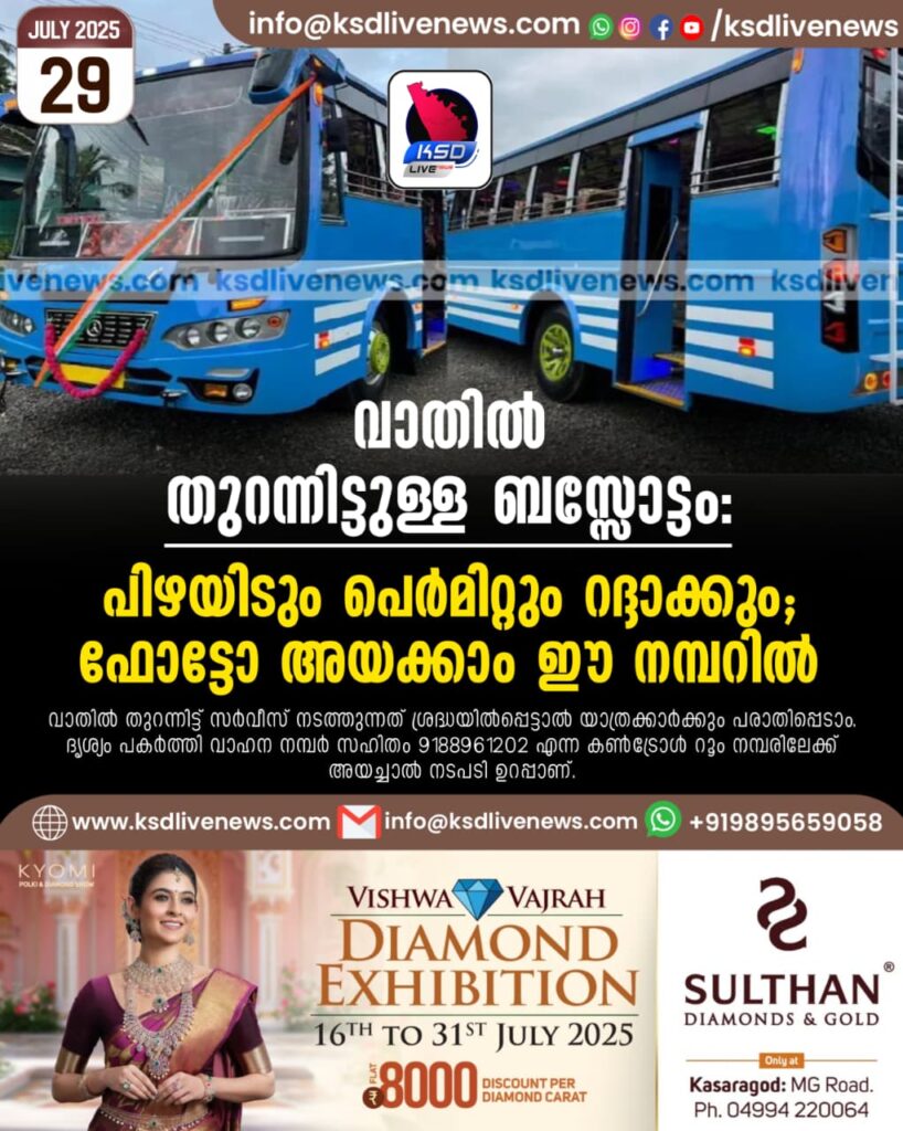 വാതില് തുറന്നിട്ടുള്ള ബസ്സോട്ടം; പിഴയിടും പെര്മിറ്റും റദ്ദാക്കും, ഫോട്ടോ അയക്കാം ഈ നമ്പറില്