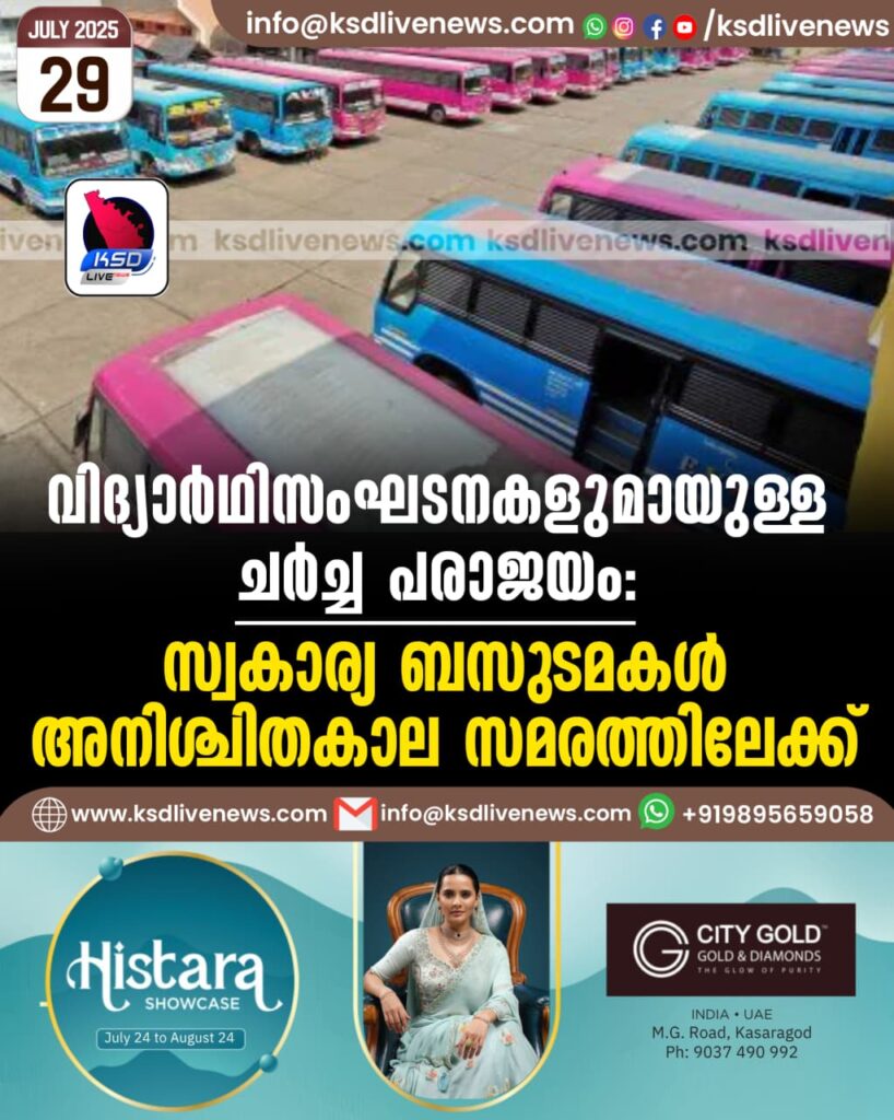 വിദ്യാര്‍ഥിസംഘടനകളുമായുള്ള ചര്‍ച്ച പരാജയം: സ്വകാര്യബസുടമകള്‍ അനിശ്ചിതകാല സമരത്തിലേക്ക്
