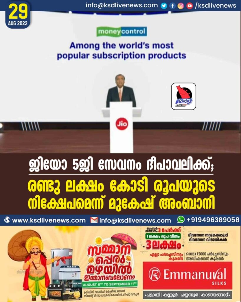ജിയോ 5ജി സേവനം ദീപാവലിക്ക്; രണ്ടുലക്ഷം കോടി രൂപയുടെ നിക്ഷേപമെന്ന് മുകേഷ് അംബാനി