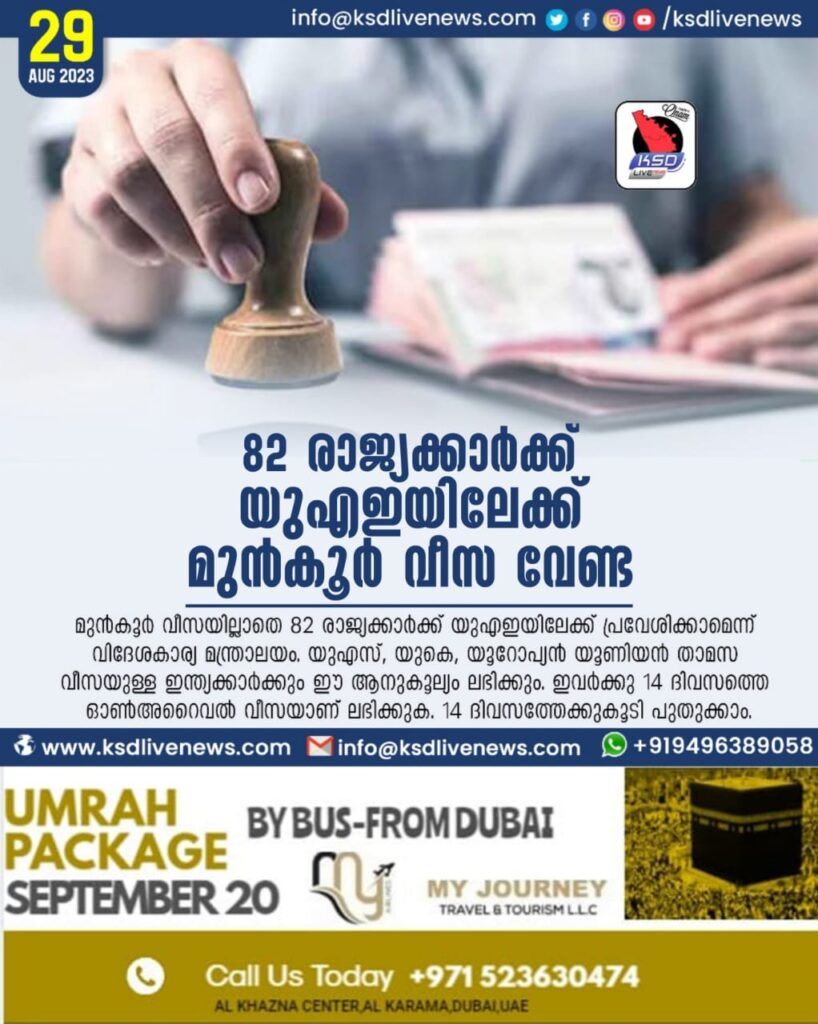 അബുദാബി ∙ മുൻകൂർ വീസയില്ലാതെ 82 രാജ്യക്കാർക്ക് യുഎഇയിലേക്ക് പ്രവേശിക്കാമെന്ന് വിദേശകാര്യ മന്ത്രാലയം. യുഎസ്, യുകെ, യൂറോപ്യൻ യൂണിയൻ താമസ വീസയുള്ള ഇന്ത്യക്കാർക്കും ഈ ആനുകൂല്യം ലഭിക്കും. ഇവർക്കു 14 ദിവസത്തെ ഓൺഅറൈവൽ വീസയാണ് ലഭിക്കുക. 14 ദിവസത്തേക്കുകൂടി പുതുക്കാം. വീസ കൂടാതെ എത്തുന്ന രാജ്യക്കാർക്ക് 30 ദിവസം യുഎഇയിൽ തങ്ങാം. ആവശ്യമെങ്കിൽ 10 ദിവസം കൂടി താമസിക്കാൻ അനുവദിക്കും. രാജ്യത്ത് പ്രവേശിച്ച ദിവസം മുതലാണ് കാലാവധി കണക്കാക്കുക. യുഎഇയിലേക്കു പുറപ്പെടുന്നതിനു മുൻപ് വിദേശകാര്യ മന്ത്രാലയത്തിന്റെ വെബ്സൈറ്റ് സന്ദർശിച്ച് ഏറ്റവും പുതിയ വിവരങ്ങൾ മനസ്സിലാക്കണമെന്നും അഭ്യർഥിച്ചു. ‘ഞങ്ങൾ ആഘോഷിച്ച് തകർക്കും’ 115 രാജ്യങ്ങളിലെ പൗരന്മാർക്ക് രാജ്യത്തേക്ക് പ്രവേശിക്കണമെങ്കിൽ വീസ നിർബന്ധം. ജിസിസി രാജ്യങ്ങളിലെ പൗരന്മാർക്ക് അതാതു പാസ്പോർട്ടോ, ദേശീയ തിരിച്ചറിയൽ കാർഡോ കാണിച്ച് പ്രവേശനാനുമതി ലഭിക്കും.