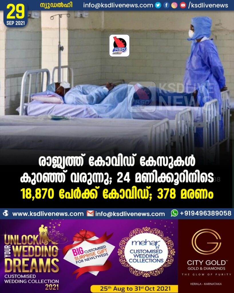 രാജ്യത്ത് കോവിഡ് കേസുകൾ കുറഞ്ഞ് വരുന്നു; 24 മണിക്കൂറിനിടെ 18,870 പേർക്ക് കോവിഡ്; 378 മരണം