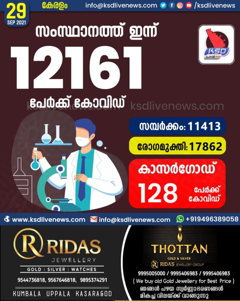 സംസ്ഥാനത്ത് ഇന്ന് 12,161 പേർക്ക് കോവിഡ് സ്ഥിരീകരിച്ചു. സമ്പർക്കം വഴി 11,413 പേർക്കും ; ആശ്വാസമായി 17,862 പേർക്ക് രോഗ മുക്തിയും ; കാസർഗോഡ് ജില്ലയിൽ 128 പേർക്ക് പുതിയ കോവിഡ് കേസുകൾ ; മരണം 115