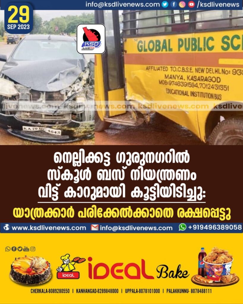 നെല്ലിക്കട്ട ഗുരുനഗറിൽ സ്‌കൂള്‍ ബസ് നിയന്ത്രണം വിട്ട് കാറുമായി കൂട്ടിയിടിച്ചു: യാത്രക്കാർ പരിക്കേല്‍ക്കാതെ രക്ഷപ്പെട്ടു