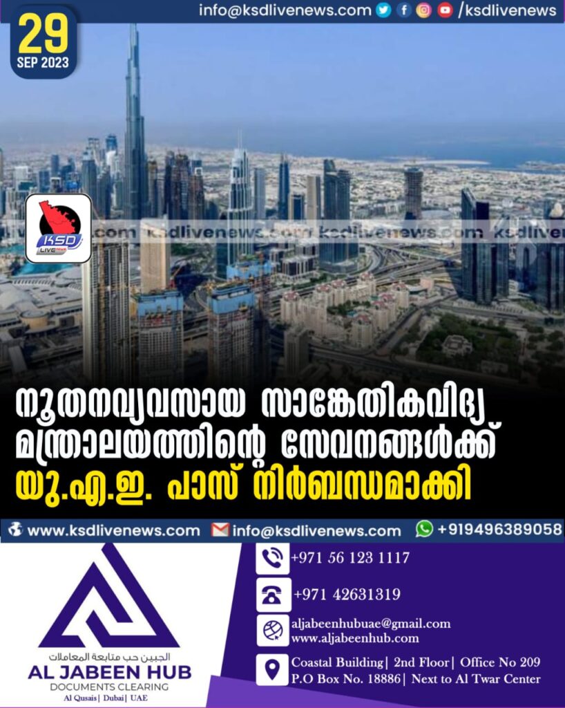 നൂതനവ്യവസായ സാങ്കേതികവിദ്യ മന്ത്രാലയത്തിന്റെ സേവനങ്ങൾക്ക് യു.എ.ഇ. പാസ് നിർബന്ധമാക്കി