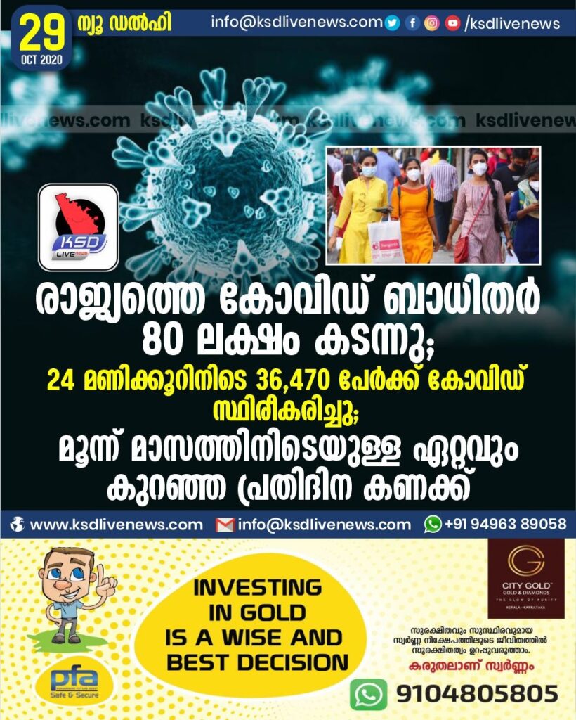 രാജ്യത്തെ കോവിഡ് ബാധിതർ 80 ലക്ഷം കടന്നു ; 24 മണിക്കൂറിനിടെ 36,470 പേർക്ക് കോവിഡ് സ്ഥിരീകരിച്ചു ;
