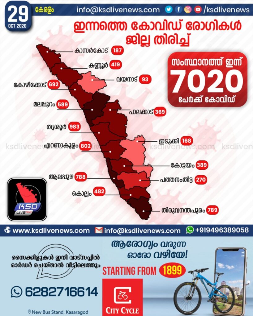 കേരളത്തില് ഇന്ന് 7020 പേര്ക്ക് കോവിഡ്-19 സ്ഥിരീകരിച്ചതായി മുഖ്യമന്ത്രി പിണറായി വിജയന്. തൃശൂര് 983, എറണാകുളം 802, തിരുവനന്തപുരം 789, ആലപ്പുഴ 788, കോഴിക്കോട് 692, മലപ്പുറം 589, കൊല്ലം 482, കണ്ണൂര് 419, കോട്ടയം 389, പാലക്കാട് 369, പത്തനംതിട്ട 270, കാസര്ഗോഡ് 187, ഇടുക്കി 168, വയനാട് 93 എന്നിങ്ങനേയാണ് ജില്ലകളില് ഇന്ന് രോഗ ബാധ സ്ഥിരീകരിച്ചത്.