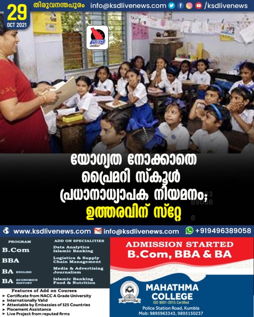 യോഗ്യത നോക്കാതെ പ്രൈമറി സ്കൂൾ പ്രധാനാധ്യാപക നിയമനം: ഉത്തരവിന് സ്റ്റേ