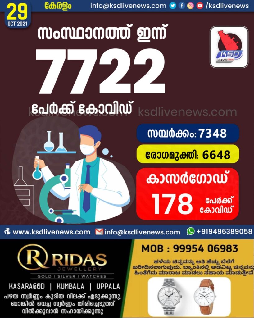 സംസ്ഥാനത്ത് ഇന്ന് 7722 പേർക്ക് കോവിഡ് സ്ഥിരീകരിച്ചു. സമ്പർക്കം വഴി 7348 പേർക്കും ; ആശ്വാസമായി 6648 പേർക്ക് രോഗ മുക്തിയും ; കാസർഗോഡ് ജില്ലയിൽ 178 പേർക്ക് പുതിയ കോവിഡ് കേസുകൾ ; മരണം 86