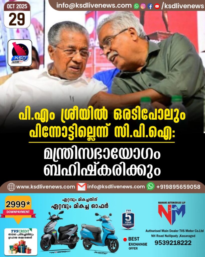 പി.എം ശ്രീയില് ഒരടിപോലും പിന്നോട്ടില്ലെന്ന് സിപിഐ: മന്ത്രിസഭായോഗം ബഹിഷ്കരിക്കും