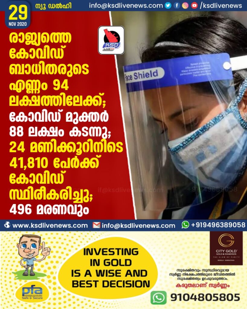 രാജ്യത്തെ കോവിഡ് ബാധിതരുടെ എണ്ണം 94 ലക്ഷത്തിലേക്ക്; കോവിഡ് മുക്തർ 88 ലക്ഷം കടന്നു ;