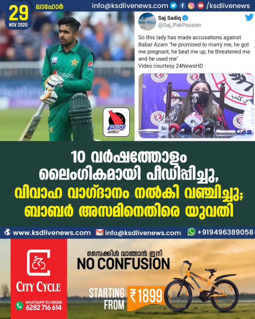 ലാഹോര്‍: പാക് ക്രിക്കറ്റ് ടീം നായകന്‍ ബാബര്‍ അസമിനെതിരെ ഗുരുതര ആരോപണവുമായി യുവതി. വിവാഹം കഴിക്കാമെന്ന് പറഞ്ഞ് വഞ്ചിച്ചതായും, ലൈംഗീകമായി പീഡിപ്പിച്ചതായും യുവതി ആരോപിക്കുന്നു.