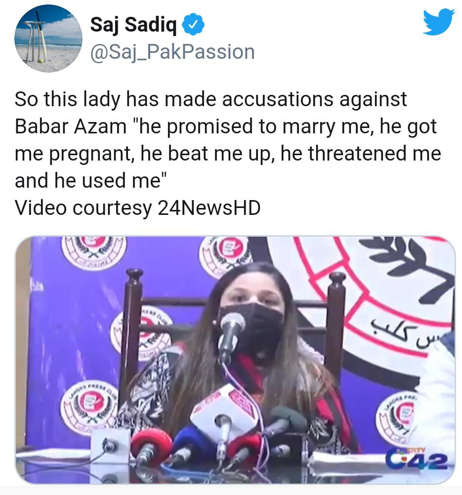 ഒരേ നാട്ടിലാണ് ഞാനും ബാബറും വളര്‍ന്നത്. സ്‌കൂളില്‍ സുഹൃത്തുക്കളായിരുന്നു. ഒരുമിച്ചായിരുന്നു ഈ സമയമെല്ലാം ഞങ്ങള്‍.2010ല്‍ എന്റെ നാട്ടില്‍ വെച്ച്‌ ബാബര്‍ എന്നോട് വിവാഹാഭ്യര്‍ഥന നടത്തി. ഞാന്‍ അത് സ്വീകരിച്ചുസമയം മുന്‍പോട്ട് പോയപ്പോള്‍ ഞങ്ങള്‍ കൂടുതല്‍ അടുക്കുകയും വിവാഹം കഴിക്കാന്‍ തീരുമാനിക്കുകയും ചെയ്തു. എന്നാല്‍ ഞങ്ങളുടെ കുടുംബങ്ങള്‍ ഇതിന് എതിരായിരുന്നു. വാടക വീടുകളിലാണ് എന്നെ ബാബര്‍ താമസിപ്പിച്ചിരുന്നത്. വിവാഹിതരാവാന്‍ ഞാന്‍ ബാബറിനോട് ആവശ്യപ്പെട്ടെങ്കിലും ബാബര്‍ അത് നീട്ടിക്കൊണ്ടു പോയി.വിവാഹം കഴിക്കാമെന്ന് എനിക്ക് വാഗ്ദാനം നല്‍കി. എന്നെ ഗര്‍ഭിണിയാക്കി, മര്‍ദിച്ചു. എന്നെ ഭീഷണിപ്പെടുത്തുകയും ഉപയോഗിക്കുകയും ചെയ്തു, യുവതി ആരോപിക്കുന്നു. എന്നാല്‍ ഇതേ യുവതി തന്നെ ബാബറിന് എതിരെ ആരോപണം ഉന്നയിച്ച്‌ എത്തിയിരുന്നതായും, പിന്നാലെ ബാബറിനോട് ഇവര്‍ ക്ഷമ പറഞ്ഞതായും പാക് മാധ്യമപ്രവര്‍ത്തകനായ സജ് സാദിഖ് പറയുന്നു.
