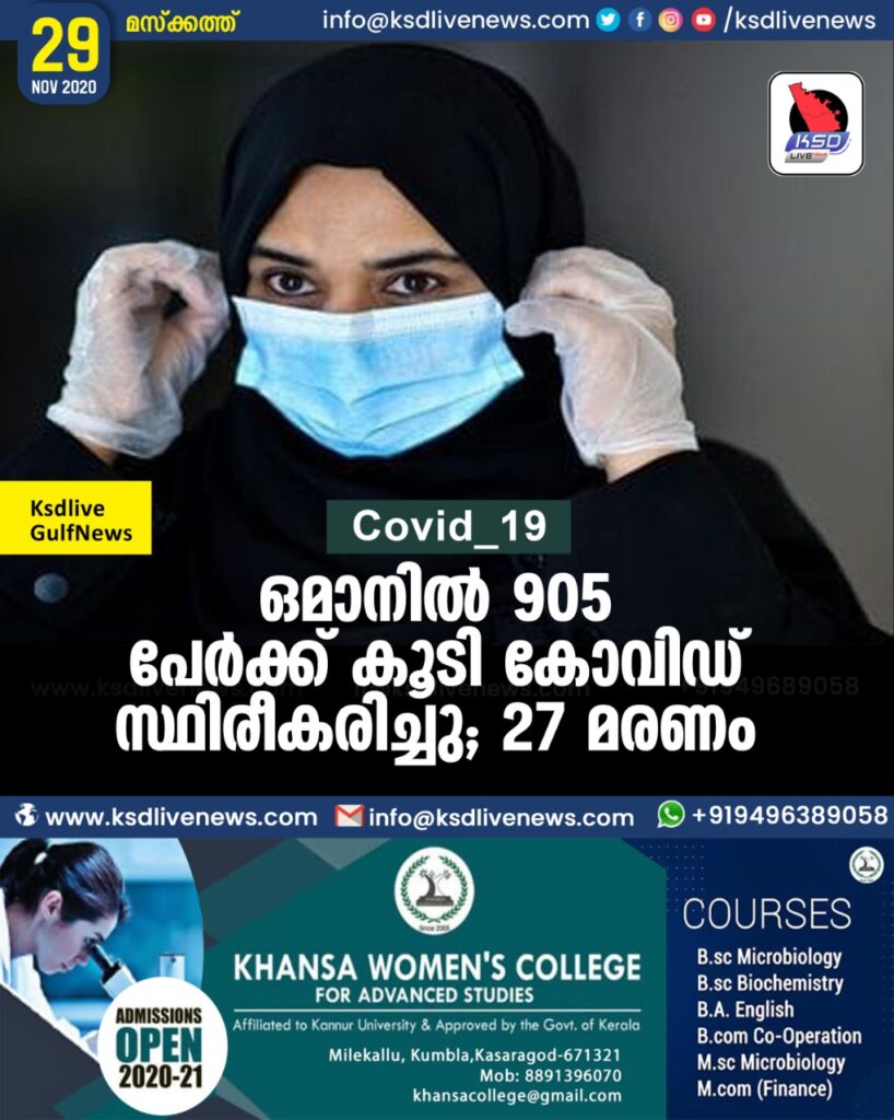 ഒമാനിൽ 905 പേർക്ക് കൂടി കോവിഡ് സ്ഥിരീകരിച്ചു ; 27 മരണം