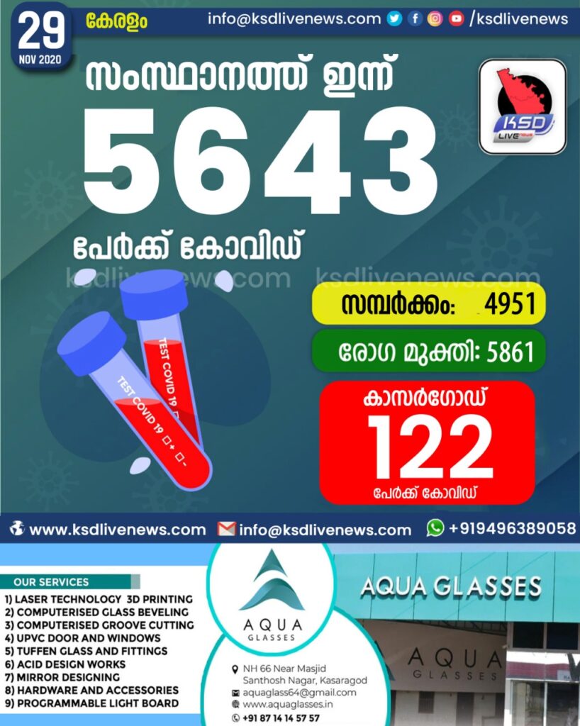 സംസ്ഥാനത്ത് ഇന്ന് 5643 പേർക്ക് കോവിഡ് സ്ഥിരീകരിച്ചു. സമ്പർക്കം വഴി 4951 പേർക്കും ; ആശ്വാസമായി 5861 പേർക്ക് രോഗ മുക്തിയും ; കാസർഗോഡ് ജില്ലയിൽ 123 പേർക്ക് പുതിയ കോവിഡ് കേസുകൾ ; മരണം 27