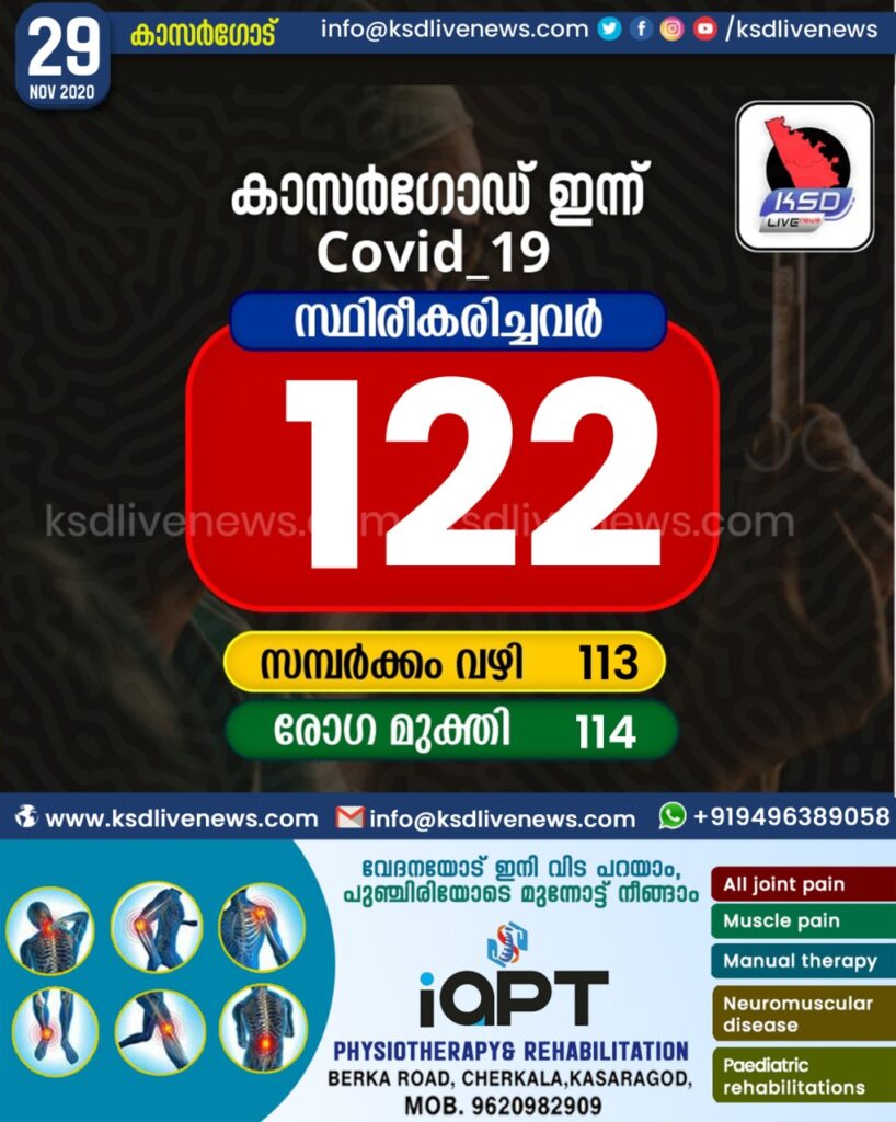 കാസര്കോട് ജില്ലയില് 122 പേര്ക്ക് കോവിഡ്, 114 പേര്ക്ക് രോഗമുക്തി