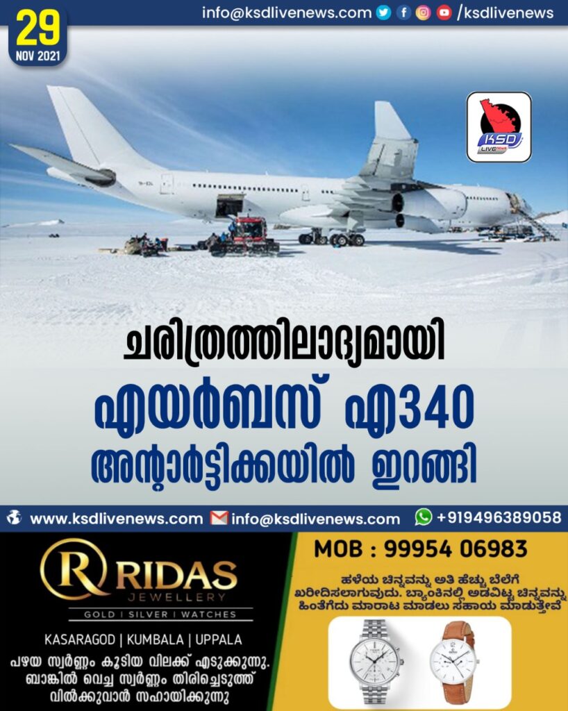 ചരിത്രത്തിലാദ്യമായി എയർബസ് എ340 അന്റാർട്ടിക്കയുടെ മഞ്ഞുമൂടിയ പ്രദേശത്ത് ലാൻഡ് ചെയ്തു. ഈ ചരിത്ര നേട്ടത്തിന്റെ ഏഴ് മിനിറ്റ് ദൈർഘ്യമുള്ള ക്ലിപ്പ് ഇപ്പോൾ ഓൺലൈനിൽ പ്രചരിക്കുന്നുണ്ട്. പൈലറ്റ് കാർലോസ് മിർപുരിയും സംഘവും നവംബർ 2 ന് ദക്ഷിണാഫ്രിക്കയിലെ കേപ് ടൗണിൽ നിന്നാണ് 4,506 കിലോമീറ്റർ യാത്ര ആരംഭിച്ചത്. ലക്ഷ്യസ്ഥാനത്ത് എത്താൻ അഞ്ച് മണിക്കൂറിലധികം എടുത്തു.