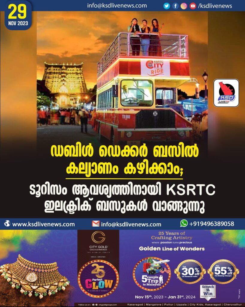 ഡബിള് ഡെക്കര് ബസില് കല്യാണം കഴിക്കാം; ടൂറിസം ആവശ്യത്തിനായി KSRTC ഇലക്ട്രിക് ബസുകള് വാങ്ങുന്നു