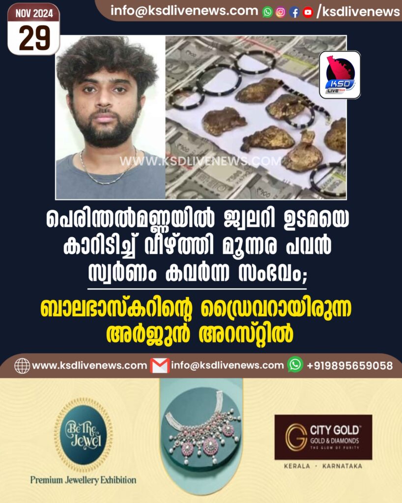 പെരിന്തൽമണ്ണയിൽ ജ്വലറി ഉടമയെ കാറിടിച്ച് വീഴ്ത്തി മൂന്നര കിലോ സ്വര്ണം കവർന്ന സംഭവം; ബാലഭാസ്കറിന്റെ ഡ്രൈവറായിരുന്ന അര്ജുൻ അറസ്റ്റില്