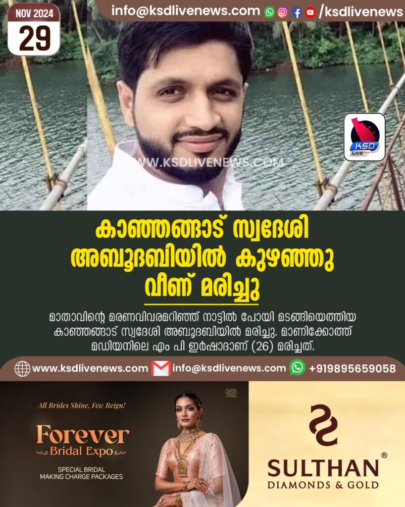 അബൂദബി: മാതാവിന്റെ മരണവിവരമറിഞ്ഞ് നാട്ടില്‍ പോയി മടങ്ങിയെത്തിയ കാഞ്ഞങ്ങാട് സ്വദേശി അബൂദബിയില്‍ മരിച്ചു. മാണിക്കോത്ത് മഡിയനിലെ എം പി ഇര്‍ഷാദാണ് (26) മരിച്ചത്. രണ്ടാഴ്ച മുമ്ബ് മാതാവിന്റെ മരണവിവരം അറിഞ്ഞ് ഇര്‍ഷാദ് നാട്ടിലെത്തിയിരുന്നു. ശേഷം മാതാവിന്റെ ഖബറടക്കം പൂര്‍ത്തിയാക്കി അബൂദബിയില്‍ തന്നെ മടങ്ങിയെത്തിയ ഇര്‍ഷാദ് കുഴഞ്ഞു വീഴുകയായിരുന്നു.