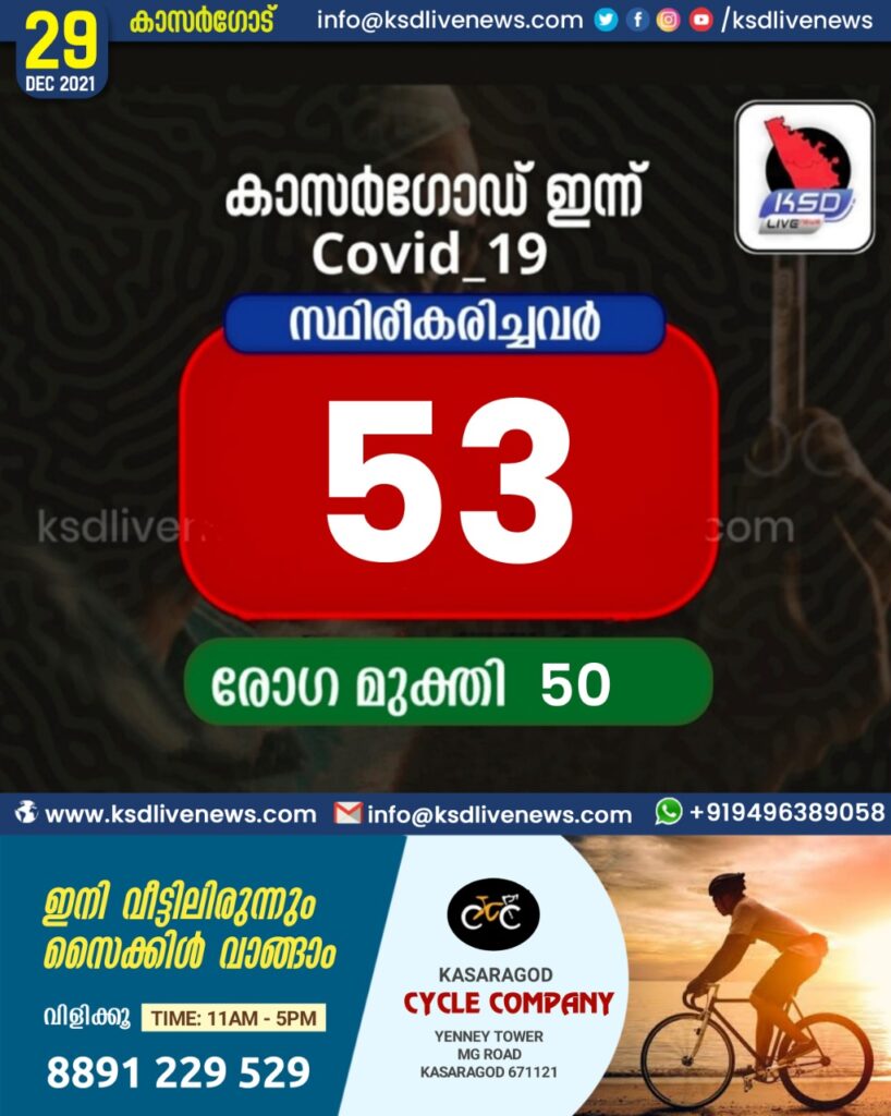 കാസര്‍കോട് ജില്ലയിൽ 53 പേര്‍ കൂടി കോവിഡ്-19 പോസിറ്റീവായി. ചികിത്സയിലുണ്ടായിരുന്ന 50