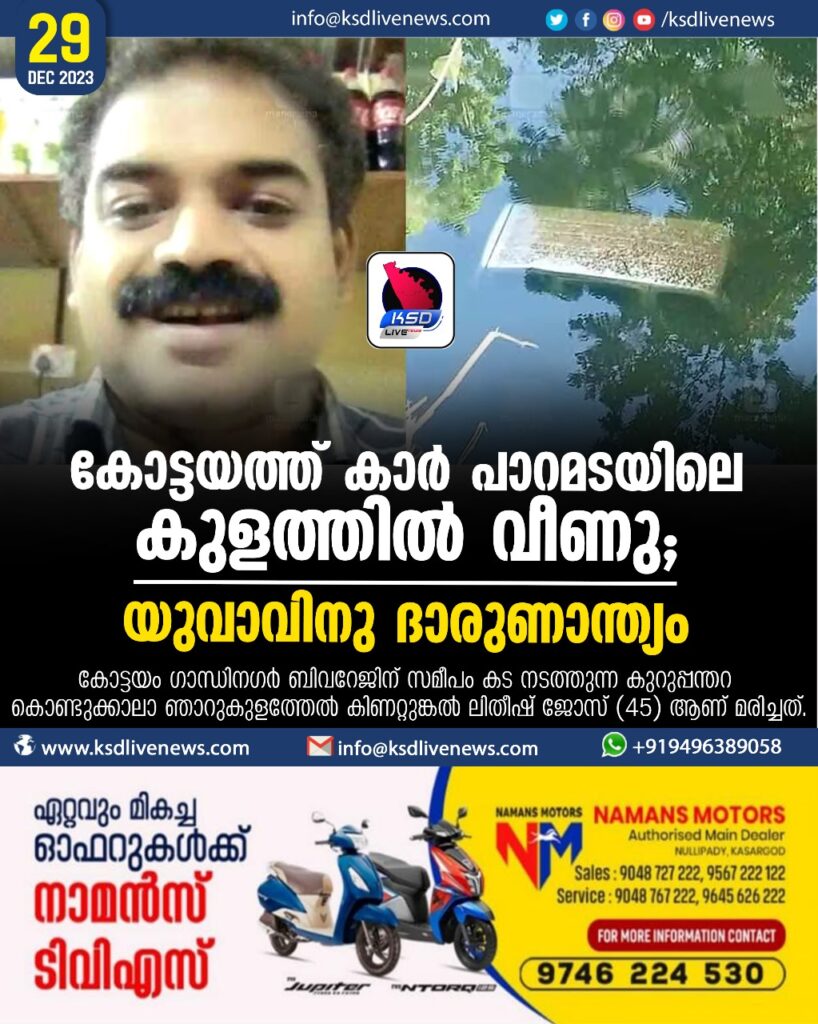 കോട്ടയത്ത് കാർ പാറമടയിലെ കുളത്തിൽ വീണു; യുവാവിനു ദാരുണാന്ത്യം