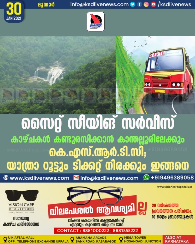 ജനുവരി 31 ഞായറാഴ്ച മുതലാണ് സൈറ്റ് സീയിങ് സർവീസ് തുടങ്ങുന്നത്. രാവിലെ 9.30-ന് പഴയ മൂന്നാർ ഡിപ്പോയിൽനിന്നാരംഭിക്കുന്ന സർവീസ് എട്ടാംമൈൽ, ലക്കം വെള്ളച്ചാട്ടം, മറയൂർ ചന്ദന റിസർവ്, മുനിയറകൾ എന്നിവ സന്ദർശിച്ച് ഉച്ചകഴിഞ്ഞ് കാന്തല്ലൂരിലെത്തും.