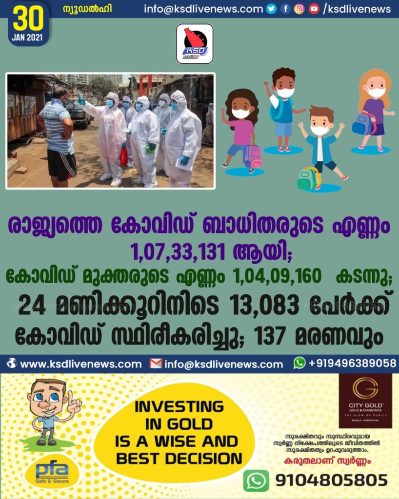 24 മണിക്കൂറിനിടെ 13,083 പേർക്ക് കോവിഡ് സ്ഥിരീകരിച്ചു ; 137 മരണവും