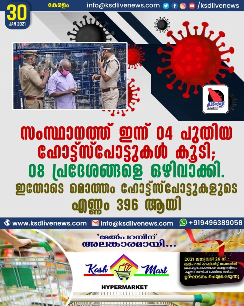 സംസ്ഥാനത്ത് ഇന്ന് 04 പുതിയ ഹോട്ട്സ്പോട്ടുകള് കൂടി; 08 പ്രദേശങ്ങളെ ഒഴിവാക്കി. ഇതോടെ മൊത്തം ഹോട്ട്സ്പോട്ടുകളുടെ എണ്ണം 396 ആയി.