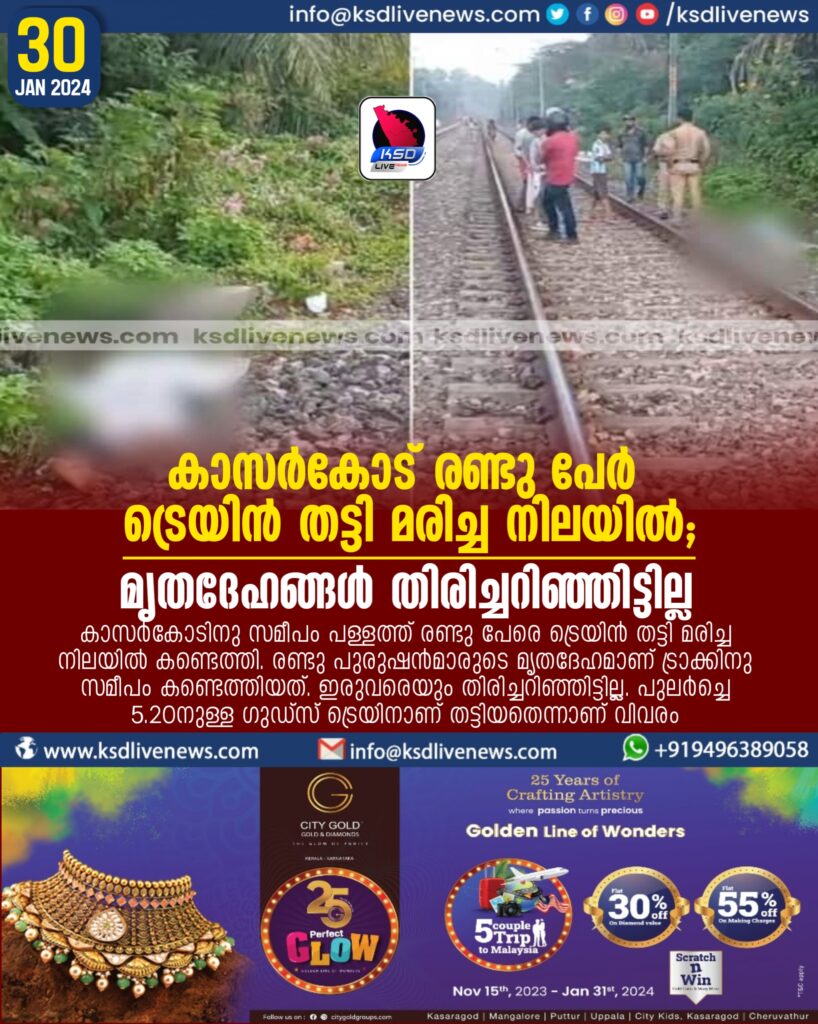 കാസർകോട് രണ്ടു പേർ ട്രെയിൻ തട്ടി മരിച്ച നിലയിൽ; മൃതദേഹങ്ങൾ തിരിച്ചറിഞ്ഞിട്ടില്ല