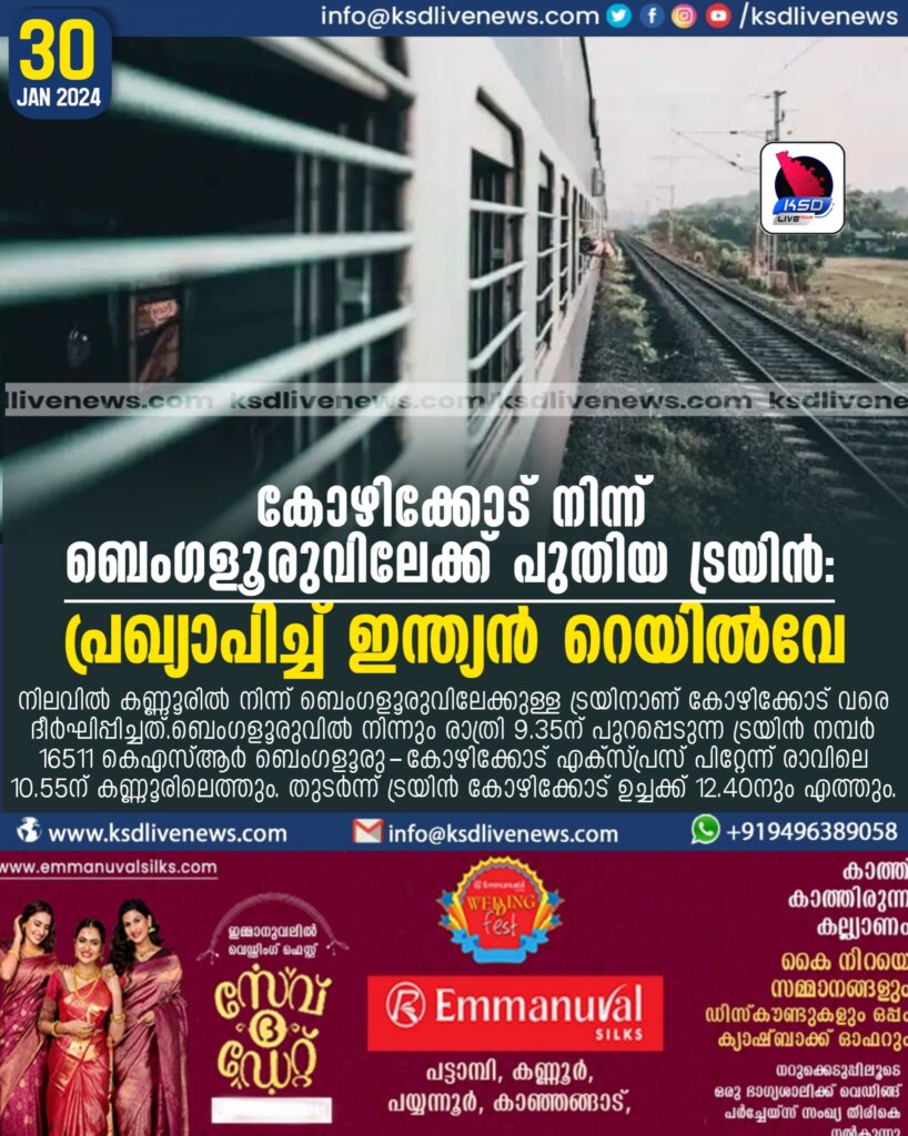 കോഴിക്കോട് നിന്ന് ബെംഗളൂരുവിലേക്ക് പുതിയ ട്രയിന് : പ്രഖ്യാപിച്ച് ഇന്ത്യന് റെയില്വേ