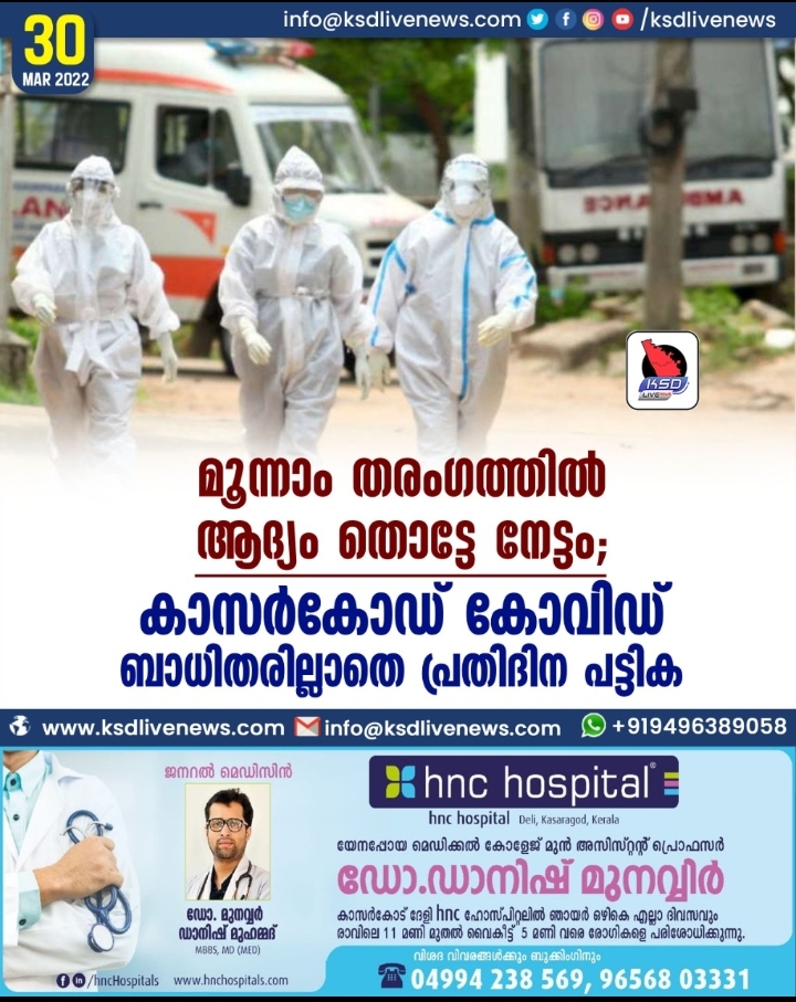 കോവിഡ് മൂന്നാം തരംഗത്തിൽ ജില്ലയ്ക്ക് ആദ്യം മുതൽക്കേ നേട്ടമായിരുന്നു. എ, ബി, സി കാറ്റഗറികളാക്കി ജില്ലകളെയും വിവിധ പ്രദേശങ്ങളെയും തിരിച്ചപ്പോൾ അതിലൊന്നും പെടാതെ കാസർകോട് നേട്ടം കൊയ്തു. ഈ കാറ്റഗറിയിൽപ്പെടാതിരുന്ന സംസ്ഥാനത്തെ ഏക ജില്ലയും കാസർകോട് തന്നെ. പ്രതിരോധമരുന്ന് നൽകുന്നതിലും മികച്ച പ്രകടനമാണ് ജില്ലാ ആരോഗ്യവകുപ്പ് നടത്തിയത്. ഏറ്റവുമൊടുവിൽ കുട്ടികൾക്കുള്ള പ്രതിരോധ കുത്തിവെപ്പിന്റെ കാര്യമെടുത്താലും ഇതര ജില്ലകളെക്കാൾ മുന്നിലെത്താൻ കാസർകോടിന് കഴിഞ്ഞു