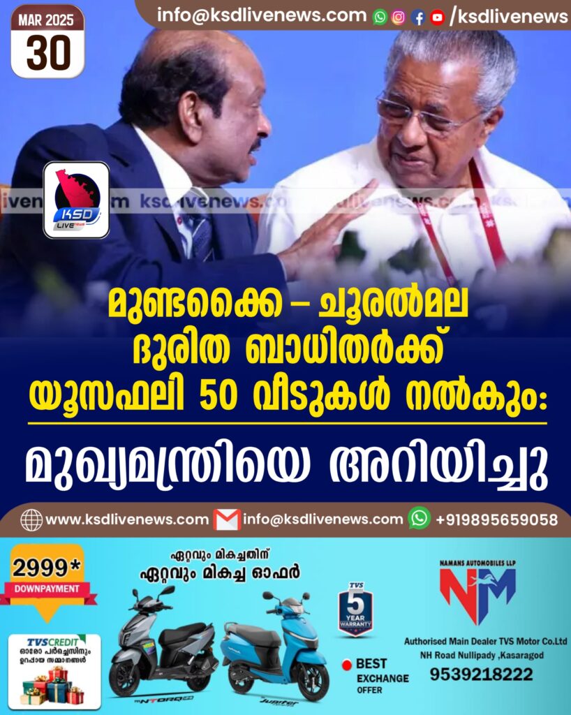 മുണ്ടക്കൈ-ചൂരല്മല ദുരിത ബാധിതര്ക്ക് യൂസഫലി 50 വീടുകള് നല്കും; മുഖ്യമന്ത്രിയെ അറിയിച്ചു