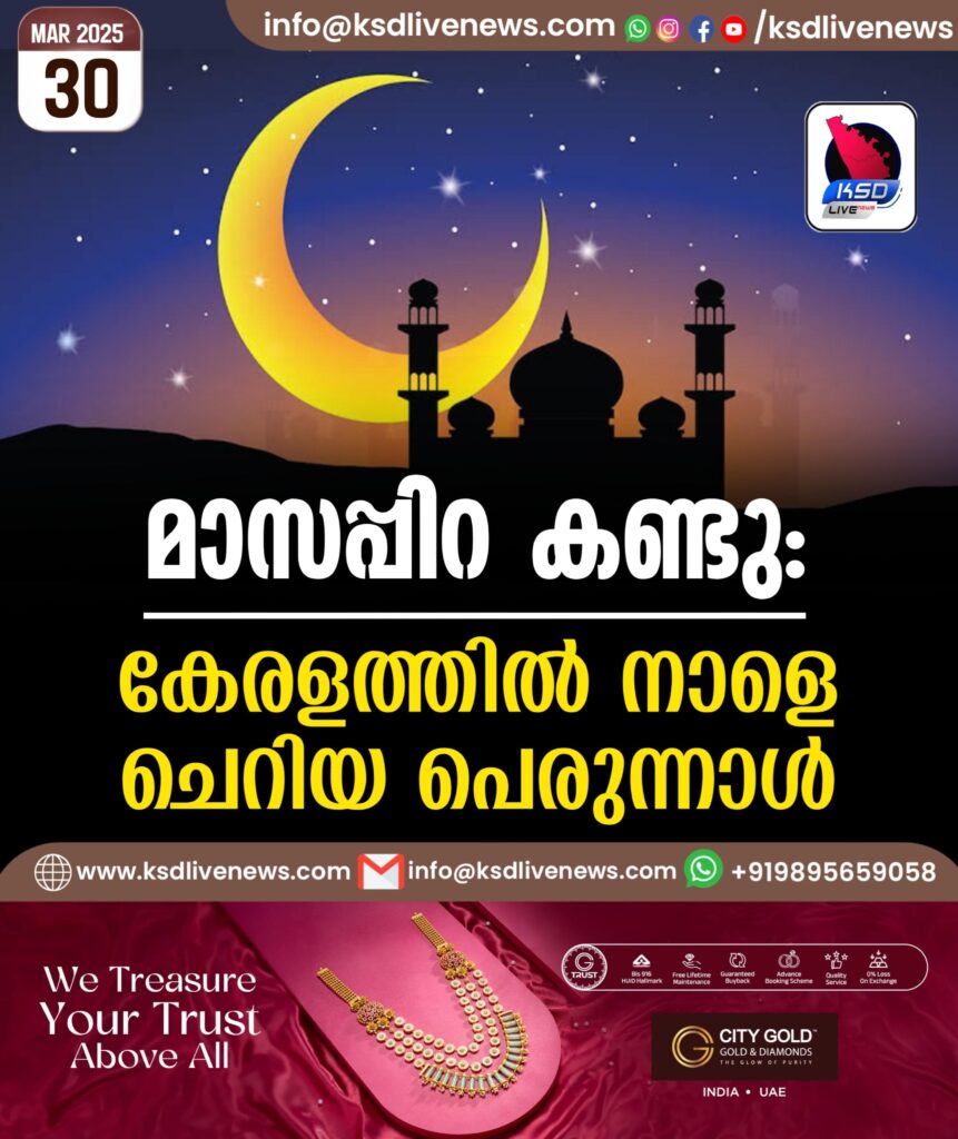 മാസപ്പിറ കണ്ടു: കേരളത്തിൽ നാളെ ചെറിയ പെരുന്നാൾSHARE THIS ONകോഴിക്കോട്: ശവ്വാൽ മാസപ്പിറവി കണ്ടതിനാൽ സംസ്ഥാനത്ത് നാളെ ചെറിയ പെരുന്നാൾ ആയിരിക്കുമെന്ന് വിവിധ ഖാദിമാര് അറിയിച്ചു. ഒരു മാസം നീണ്ടുനിന്ന വ്രതാനുഷ്ഠാനത്തിന് ശേഷമാണ് ഇസ്ലാംമത വിശ്വാസികൾ ചെറിയ പെരുന്നാൾ ആഘോഷിക്കുന്നത്.