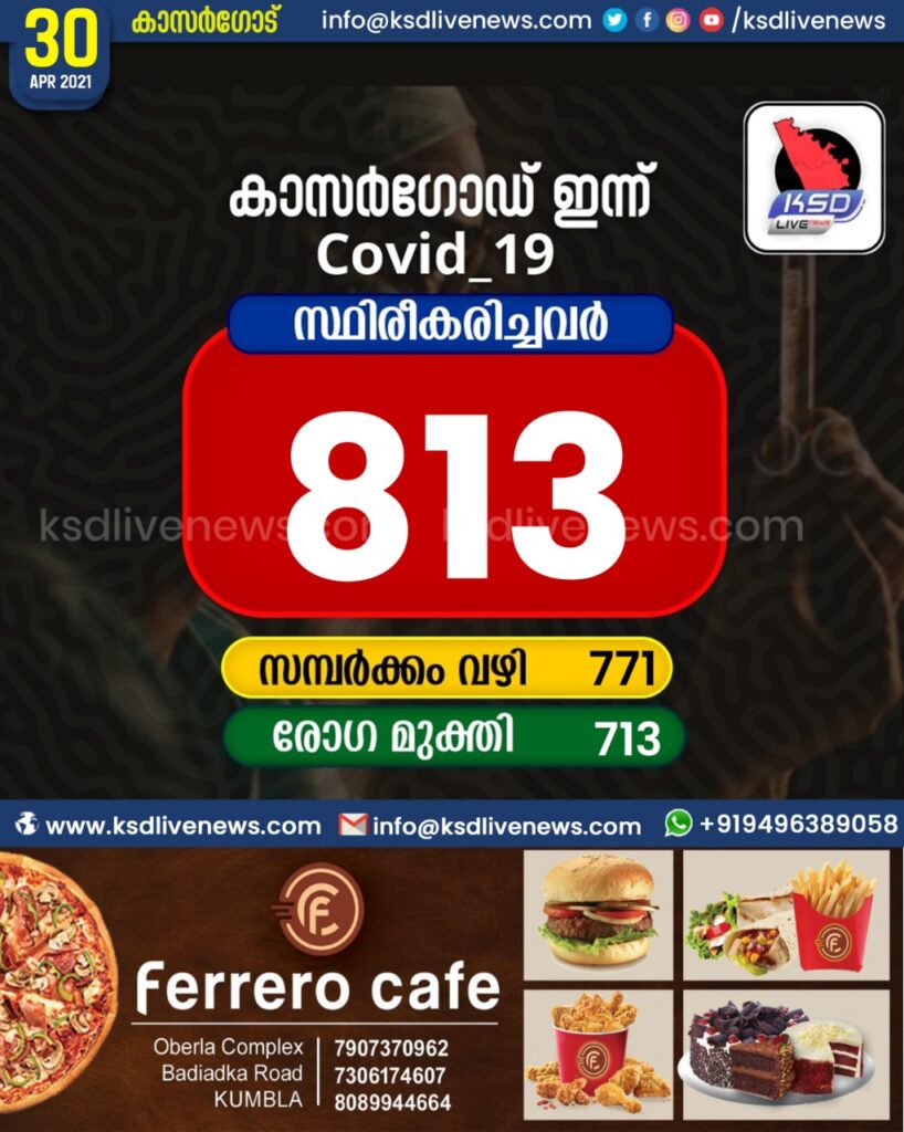 കുതിച്ചുയർന്ന് കോവിഡ് ; കാസർഗോഡ് ജില്ലയിൽ ഇന്ന് 813 പേർക്ക് കോവിഡ് സ്ഥിരീകരിച്ചു. സമ്പർക്കം വഴി 771 പേർക്കും. 713 പേർക്ക് രോഗമുക്തി