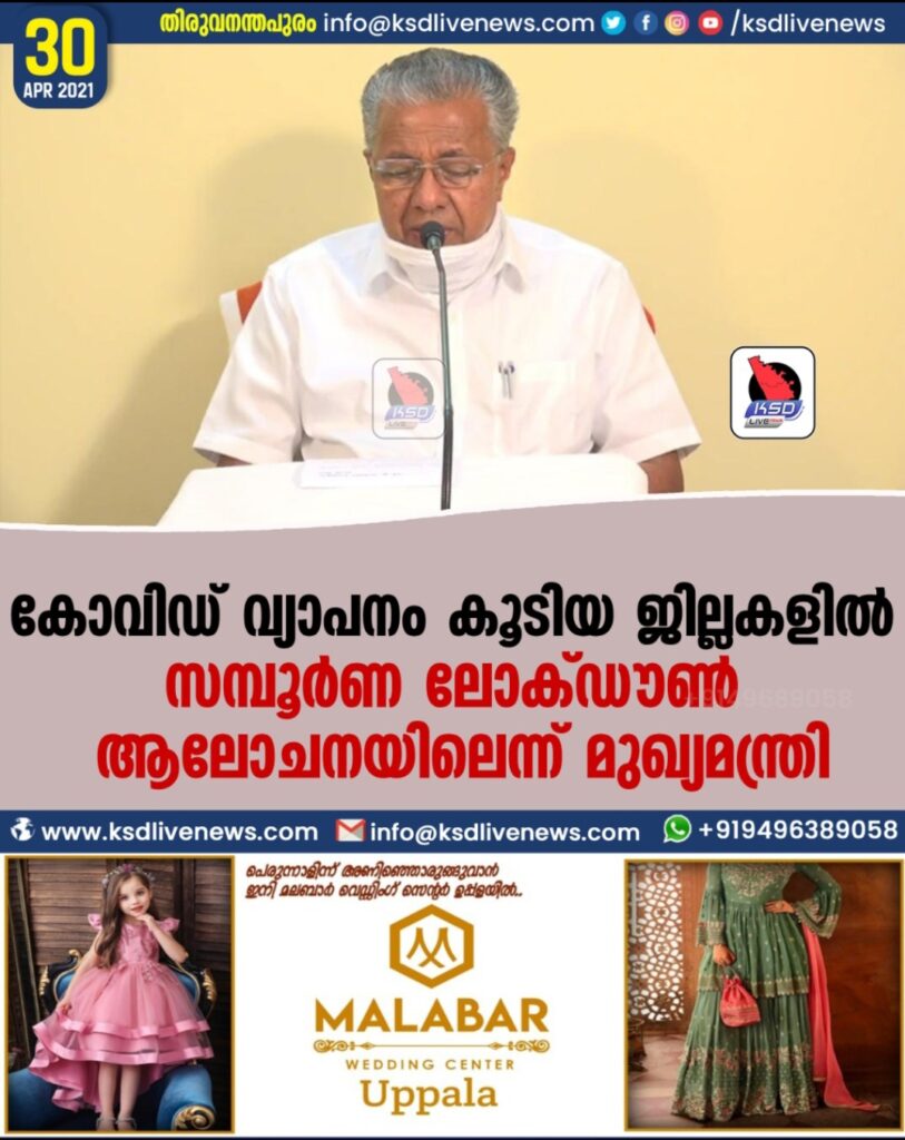 കോവിഡ് വ്യാപനം കൂടിയ ജില്ലകളില് സമ്പൂര്ണ ലോക്ഡൗണ് ആലോചനയിലെന്ന് മുഖ്യമന്ത്രി