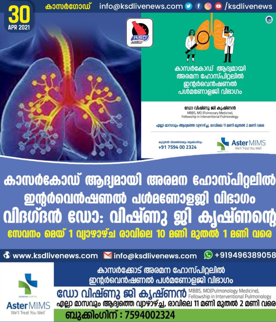 കാസർകോഡ് ആദ്യമായി അരമന ഹോസ്പിറ്റലിൽ ഇന്റർവെൻഷണൽ പൾമണോളജി വിഭാഗം വിദഗ്ദൻ ഡോ : വിഷ്ണു ജി കൃഷ്ണന്റെ സേവനം മെയ് 1 വ്യാഴാഴ്ച രാവിലെ 10 മണി മുതൽ 1 മണി വരെ