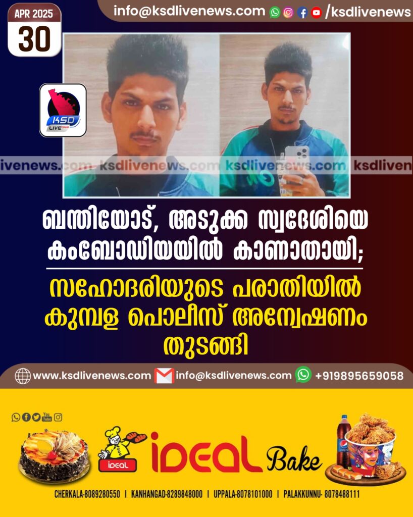 ബന്തിയോട്, അടുക്ക സ്വദേശിയെ കംബോഡിയയില്‍ കാണാതായി; സഹോദരിയുടെ പരാതിയില്‍ കുമ്പള പൊലീസ് അന്വേഷണം തുടങ്ങി