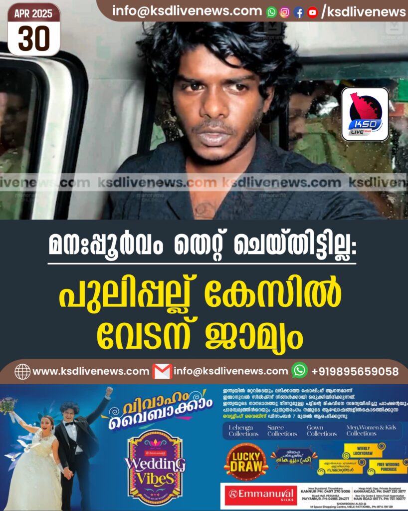 കൊച്ചി: പുലിപ്പല്ല് കൈവശം വച്ച കേസിൽ റാപ്പർ വേടന് (ഹിരൺ ദാസ് മുരളി) ജാമ്യം. പെരുമ്പാവൂര്‍ ഒന്നാം ക്ലാസ് മജിസ്‌ട്രേറ്റ് കോടതിയാണു വേടന് ജാമ്യം അനുവദിച്ചത്. മനഃപ്പൂർവം തെറ്റ് ചെയ്തിട്ടില്ലെന്നു വേടന്‍ ജാമ്യാപേക്ഷയില്‍ പറഞ്ഞു. വനംവകുപ്പ് ജാമ്യാപേക്ഷയെ എതിര്‍ത്തെങ്കിലും ഈ വാദങ്ങള്‍ തള്ളിയാണു കോടതി ജാമ്യം അനുവദിച്ചത്.