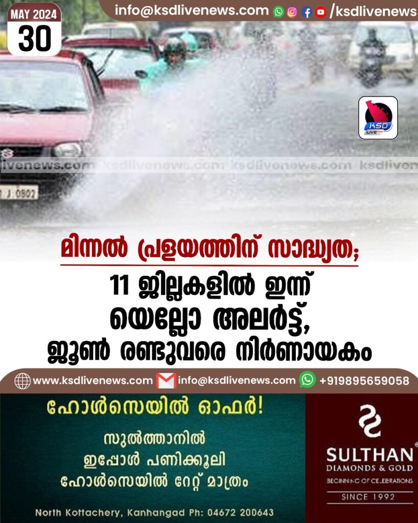 മിന്നൽ പ്രളയത്തിന് സാദ്ധ്യത; 11 ജില്ലകളിൽ ഇന്ന് യെല്ലോ അലർട്ട്, ജൂൺ രണ്ടുവരെ നിർണായകം