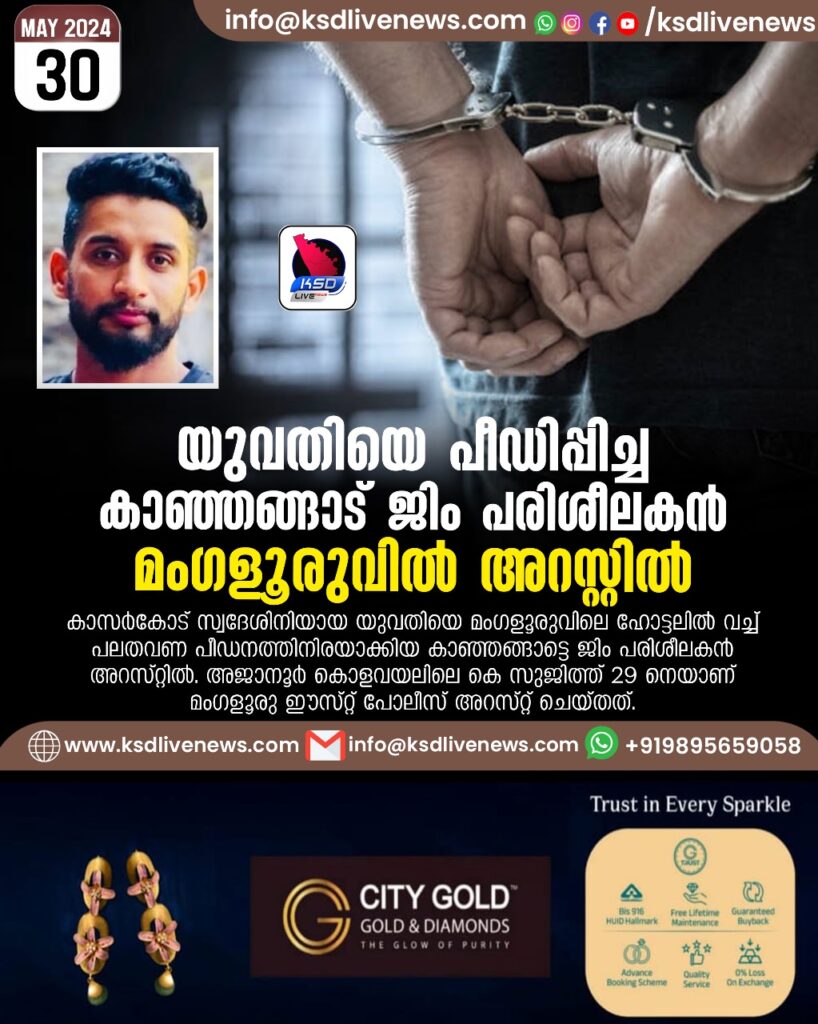 യുവതിയെ പീഡിപ്പിച്ച കാഞ്ഞങ്ങാട് ജിം പരിശീലകന്‍ മംഗളൂരുവില്‍ അറസ്റ്റില്‍
