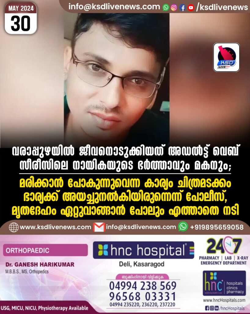വരാപ്പുഴയില് ജീവനൊടുക്കിയത് അഡല്ട്ട് വെബ് സീരീസിലെ നായികയുടെ ഭര്ത്താവും മകനും; മരിക്കാൻ പോകുന്നുവെന്ന കാര്യം ചിത്രമടക്കം ഭാര്യക്ക് അയച്ചുനല്കിയിരുന്നെന്ന് പോലീസ്, മൃതദേഹം ഏറ്റുവാങ്ങാൻ പോലും എത്താതെ നടി