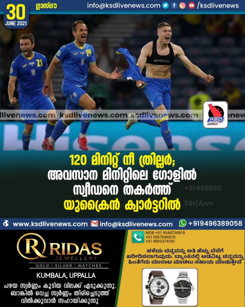 120 മിനിറ്റ് നീണ്ട ത്രില്ലര്; അവസാന മിനിറ്റിലെ ഗോളില് സ്വീഡനെ തകര്ത്ത് യുക്രൈന് ക്വാര്ട്ടറില്