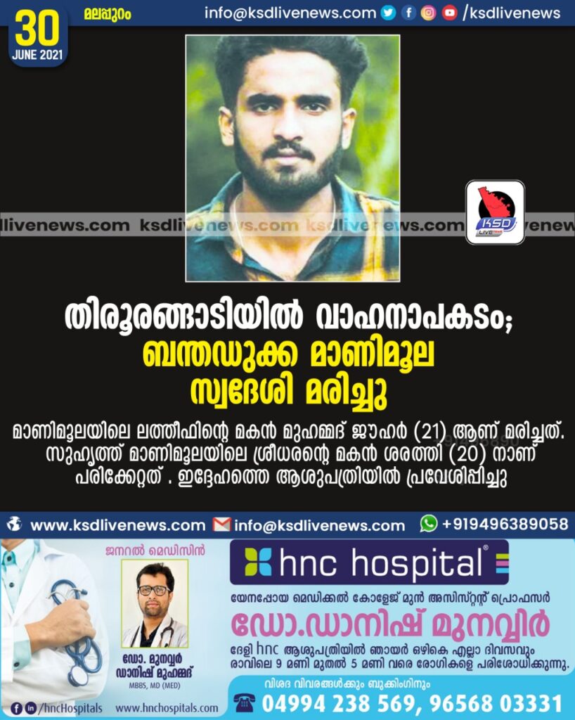 മലപ്പുറം : മലപ്പുറം , തിരൂരങ്ങാടിയിൽ ഉണ്ടായ വാഹനാപകടത്തിൽ ബന്തടുക്ക , മാണിമൂല സ്വദേശി മരിച്ചു . സുഹൃത്തിനു സാരമായി പരിക്കേറ്റു . മാണിമൂലയിലെ ലത്തീഫിന്റെ മകൻ മുഹമ്മദ് ജൗഹർ ( 21 ) ആണ് മരിച്ചത് . സുഹൃത്ത് മാണിമൂലയിലെ ശ്രീധരന്റെ മകൻ ശരത്തി ( 20 ) നാണ് പരിക്കേറ്റത് . ഇദ്ദേഹത്തെ ആശുപത്രിയിൽ പ്രവേശിപ്പിച്ചു . ഇന്നലെ രാത്രി 12.30 മണിയോടെ തിരൂരങ്ങാടിയിലാണ് അപകടം . ഇവർ സഞ്ചരിച്ചിരുന്ന ബൈക്കിൽ പിക്കപ്പ് ഇടിച്ചാണ് അപകടം . പിക്കപ്പിൽ ഉണ്ടായിരുന്നവർ പരിക്കേറ്റവരെ ഉടൻ ആശുപത്രിയിൽ എത്തിച്ചുവെങ്കിലും ജൗഹർ മരണപ്പെടുകയായിരുന്നു . എറണാകുളത്തെ സ്വകാര്യ കമ്പനിയുടെ ഇന്റർവ്യൂവിൽ പങ്കെടുത്ത് നാട്ടിലേയ്ക്ക് മടങ്ങുന്നതിനിടയിലായിരുന്നു അപകടം.മിനിഞ്ഞാന്നാണ് ഇന്റർവ്യൂവിൽ പങ്കെടുക്കുന്നതിനായി സുഹൃത്തുക്കളായ ഇരുവരും ബൈക്കിൽ യാത്ര തിരിച്ചത് . ജൗഹറിന്റെ മൃതദേഹം തിരൂർ താലൂക്ക് ആശുപത്രിയിൽ പോസ്റ്റുമോർട്ടം ചെയ്ത ശേഷം നാട്ടിലേയ്ക്ക് കൊണ്ടുപോകും . ഉമ്മാഞ്ഞിയാണ് ജൗഹറിന്റെ മാതാവ് . സഹോദരങ്ങൾ റസാഖ് , ഷംല . സജീവ കോൺഗ്രസ് പ്രവർത്തകനാണ് ജൗഹർ . ഇദ്ദേഹത്തിന്റെ അപകടമരണം നാടിനെ കണ്ണീരിലാഴ്ത്തി .